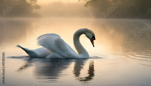 Elegant Swan Swimming in Misty Dawn Lake with Lush Greenery - Photorealistic Nature Scene