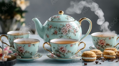 porcelain, teapot, steaming, cookie, elegant, hot beverage, afternoon tea, cup, vacation, refreshment, cosy, stylish, sweet, snack, table setting, soft light, indoor, flower, warm, classic