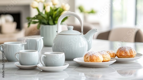 tea, teapot, cup, pastry, flower, indoor, kitchen, dining, elegant, modern, tableware, dessert, hospitality, breakfast, afternoon, snack, home, leisure, lifestyle, white, blue, porcelain, cosy, comfort, posh, serving, floral, arrangement, fresh, light, inviting, serene, culinary, relax, afternoon tea, sweetness, indulgence, presentation, gathering, culture, tradition, refreshment, design, ceramic, meal
