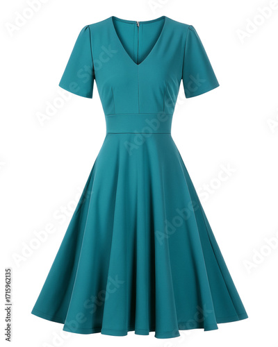 Elegant teal fit and flare dress with short sleeves and v-neckline for stylish occasions