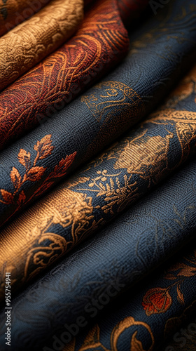 Elegant textile with intricate patterns in rich colors, perfect for luxury design projects and decorative applications.