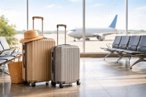 Elegant travel suitcases and straw bag in airport waiting area before flight
