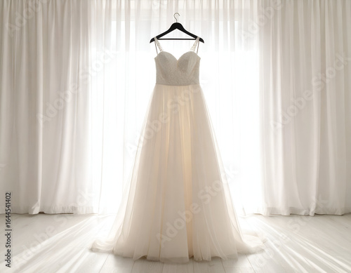 Elegant tulle wedding gown hanging gracefully before sheer white curtains, awaiting its moment to shine, a beautiful symbol of new beginnings and matrimonial joy.