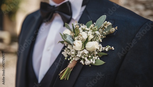 tuxedo, boutonniere, white rose, black suit, bow tie, special occasion, dress shirt, wedding day