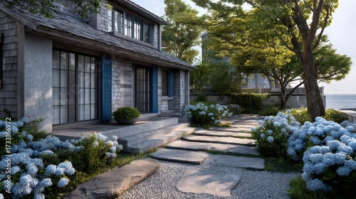 house, coastal, elegant, weathered, wood, siding, stone, wall, blue, shutter, garden, manicured, hydrangea, vibrant, flagged, path, scenic, residential, setting, window, door, greenery, rock, floral, architecture, tranquil, landscape, property, home, facades, design, charming, nature, serene, picturesque, beautiful, peaceful, surrounding