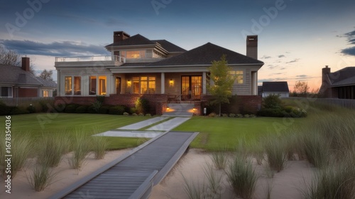 house, suburban, dusk, traditional, architecture, gable, roof, window, balcony, lawn, paseo, elegant, detached, two-story, residential, neighbourhood, landscape, twilight, comfort, beauty, facades, entranceway, lighting, peaceful, scenic, exterior, shingle, brick, plant, shrub, natural, calmness, charme, living, street, surrounding, warmth, illumination, path