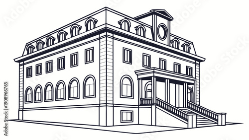 Elegant two-story mansion drawing features a prominent mansard roof, large windows, and a formal entrance with stone steps.