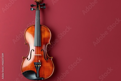 Elegant vertical violin showcased against a deep burgundy background in a striking front view