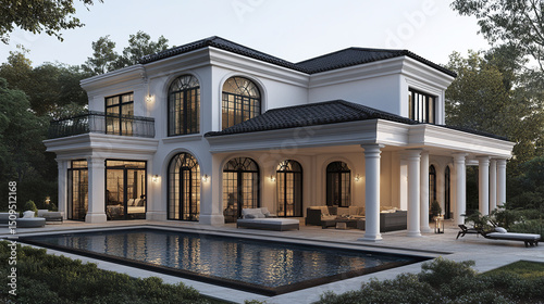 villa, house, design, elegant, architecture, pool, luxury, modern, residential, garden, landscaping, column, window, terrace, evening, exterior, home, stylish, peaceful, serene, upscale, contemporary, beautiful, inviting, roomy, sunlight, relaxation, comfort