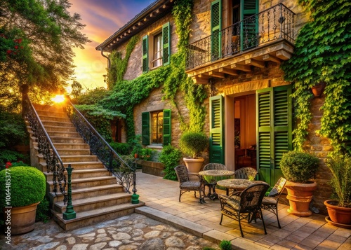 Elegant Villa Silhouette with Ivy-Clad Walls, Shaded Patio, and Manicured Garden for Serene Outdoor Living