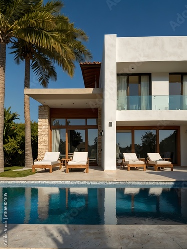 Elegant villa under clear blue sky.