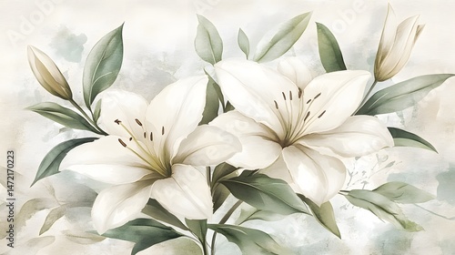 watercolor, lily, flower, floral, painting, art, botanical, illustration, elegant, green leaf, cream, beige, background, vintage, soft, delicate, romantic, nature, spring, summer, beauty, white flower, green, leaf, artistic, fine art, image, picture, design, home decor, print, poster