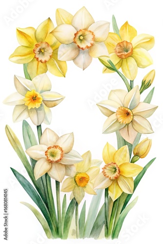 watercolor, daffodil, flower, floral, chaplet, spring, yellow, white, cream, blossom, bloom, botanical, illustration, painting, art, nature, elegant, delicate, flower petals, center, stem, leaf, green, floral pattern, greeting card, frame, border, artistic, vibrant, bright, seasonal, decorative, floral arrangement