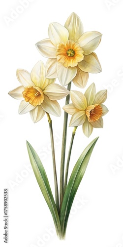 daffodil, daffodil, flower, flower, floral, blossom, blooming, bloom, spring, botanical, illustration, watercolor, painting, art, artwork, flora, nature, plant, plant, leaf, leaf, stem, white background, isolated, cut-out, garden, gardening, horticulture, easter, springtime