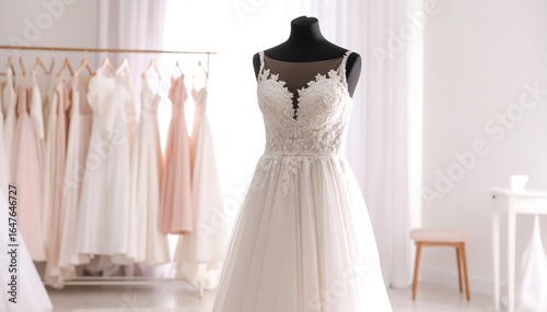wedding, dress, mannequin, bridal, gown, lace, tulle, fashion, design, elegant, showroom, boutique, atelier, choice, selection, arrangement, hanging, rack, display, interior, studio, room, apparel, clothing, preparation, celebration, ceremony, marriage, romance, romantic, light, bright, airy, minimalistic, modern, stylish, beautiful, delicate, graceful, sophistication, exquisite