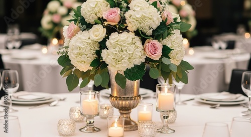 wedding, reception, centrepiece, floral, flower, rose, hydrangea, elegant, romantic, table, setting, decor, event, celebration, party, luxury, dinner, banquet, atmosphere, candlelight, warm, soft, pink, white, green, leaf, eucalyptus, vase, metallic, glasses, holder, guest, invitation, occasion, special, gathering, formal, dinnerware, cutlery, glassware, venue
