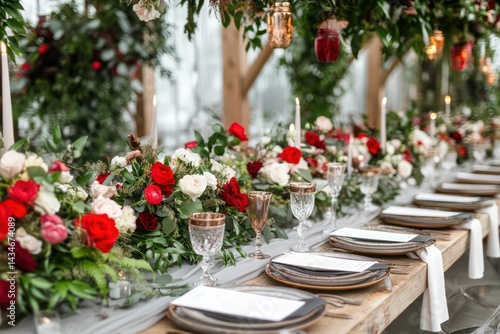 wedding, reception, table, flower, floral, arrangement, red, white, rose, gold, glassware, rustic, wooden, elegant, romantic, decor, centrepiece, candle, dinner, party, event, celebration, style, design, luxury, beautiful, sophisticated, ambience, atmosphere, setting, detail, table setting, place setting, menu, card, greenery, leaf, lichterkette, chandelier, overhead, lighting, drapery, texture, vintage, posh, glamourous, festive, modern