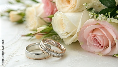 Elegant Wedding Rings on Soft White Background with Delicate Roses – Romantic Floral Decor for Weddings, Engagements, and Celebrations