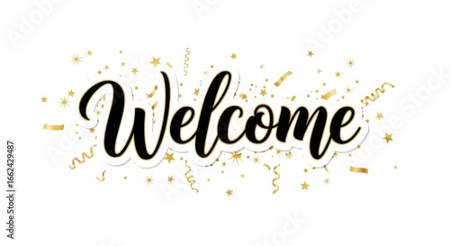 welcome, confetti, star, celebration, greeting, invitation, party, event, decorative, graphic, sparkling, banner, festive, design, gold, holiday, lettering, typography, calligraphy, handwritten, cheerful, positive, fun, elegant, stylish, artwork, ornament, abstract, illustration, surprise, postcard, card, text, shiny, luxury, glamourous, template