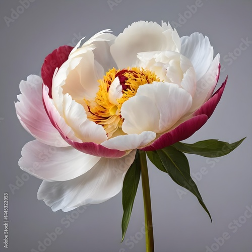peony, flower, bloom, blossom, flower petals, white, crimson, red, pink, yellow, stamen, pistil, botanical, floral, nature, plant, garden, spring, summer, beauty, delicate, elegant, macro, closeup, isolated, grey background, single flower