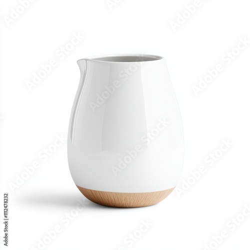 Elegant white ceramic pitcher with wooden base on a white isolated background.