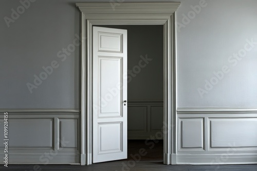 Elegant White Doorway in a Minimalist Room with Simple Moldings and Soft Gray Walls Creating a Calm and Inviting Atmosphere for Home Decor Inspiration