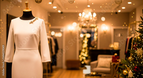 fashion, dress, white, elegant, mannequin, store, boutique, clothing, retail, outfit, new year, christmas, holiday, festive, style, apparel, window display, background, illuminated, luxury, classic, trendy, stylish, modern, celebration, design, chic, shopping, glamourous, decor, bokeh, holiday season