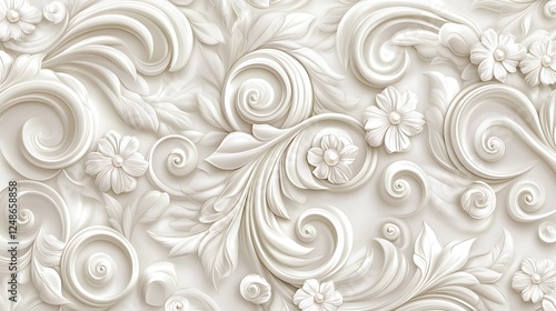 rococo, baroque, floral, design, white, cream, swirl, scroll, ornate, pattern, background, texture, wallpaper, relief, embossed, three-dimensional, render, art, decor, wall, decoration, flower, leaf, flower petals, pearl, elegance, classic, style, motif, vintage, antique, luxury, intricate, detailed, carving, stucco, gypsum, light, shadow, subtile, smooth, glossy