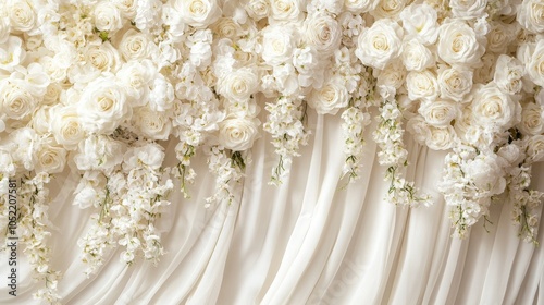 Elegant white floral wedding backdrop with cascading roses and soft drapery, creating a romantic scene