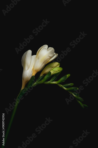 Elegant white freesia flower on a long curved stem, moody botanical macro on black background, minimalist spring floral art