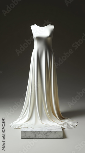 Elegant white gown displayed on a pedestal showcasing its flowing fabric and intricate design, perfect for a fashion exhibition