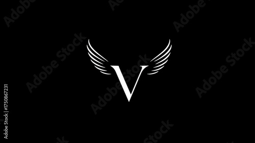 Elegant white letter V with detailed wings on a sleek black background, modern minimalist design, initial, monogram, victory symbol.