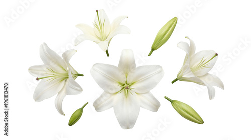 Elegant white lily flowers and fresh green buds artfully scattered, isolated on a transparent background.