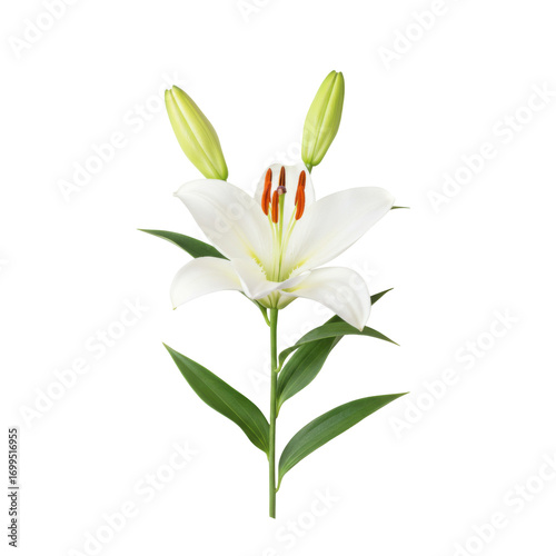 Elegant white lily with green buds and leaves, detailed floral arrangement isolated on white background