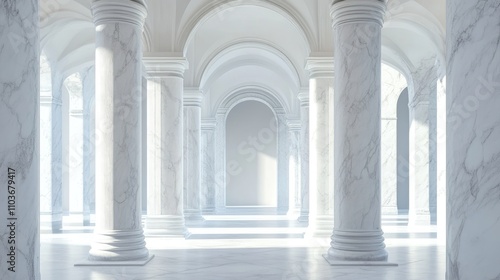 Elegant white marble pillars arranged harmoniously in a vintage architectural setting, highlighted by soft natural light and graceful arches.