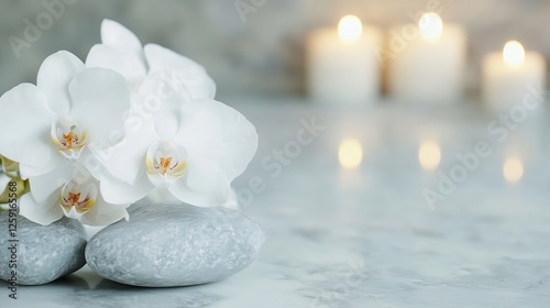 Elegant White Orchid Flowers on Relaxing Marble Surface with Candles : Generative AI