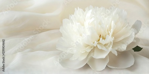 Elegant white peony flower resting on soft cream fabric backdrop creating a serene area ideal for elegant writing and delicate compositions