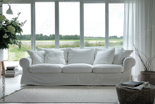 Elegant White Sofa in a Bright Living Room with Large Windows Overlooking a Scenic Green View Ideal for Cozy Interiors and Relaxation.