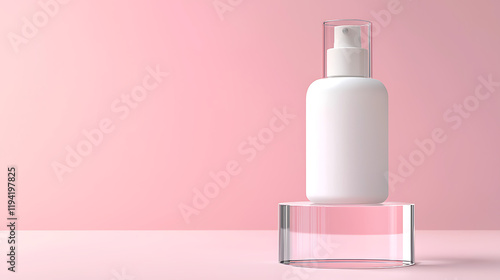 Elegant White Spray Bottle on Pink Glass Platform Cosmetic Product Mockup Beauty Packaging