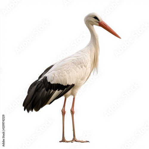Elegant White Stork with Black Wing Tips Standing on White Background