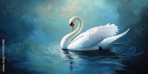 Elegant white swan gracefully gliding on calm turquoise water surrounded by soft misty blue hues creating a serene tranquil atmosphere