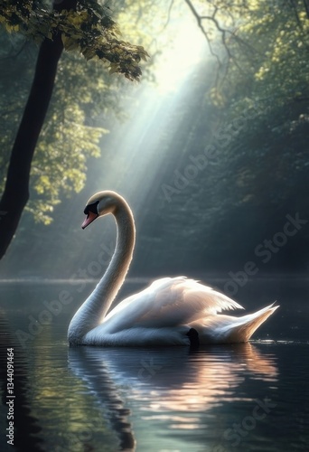 Elegant White Swan on Calm Lake in Serene Forest with Dramatic Sunlight Magical Ethereal Scene