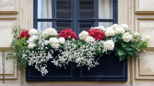 Elegant window box with a black finish, featuring white and red hydrangeas and baby's breath, adorning the exterior of an elegant Parisian building.