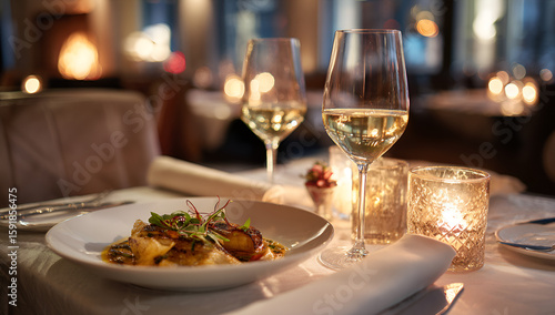 wine, glasses, white, liquid, drink, beverage, alcohol, clear, transparent, stemware, table, tablecloth, elegant, fancy, eatery, dining, dinner, celebration, romantic, light, glassware, crystal, stem, filled, poured, gold, yellow, luxury, upscale, epicure, candle, holder, decorative, pattern, texture, blurred, background, bokeh, soft, sharpened, interior, setting, arrangement, party, event, occasion, relaxation, enjoyment