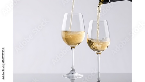 Elegant wine glasses capturing the graceful pour of white wine in a clean studio setting.