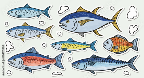 fish, sea, fishing, animal, vector, illustration, water, tuna, ocean, food, cartoon, marin, icon, nature, fin, underwater, seafood, aquatic, silhouette, art, set, wildlife, salmon, carp, swim, red bow