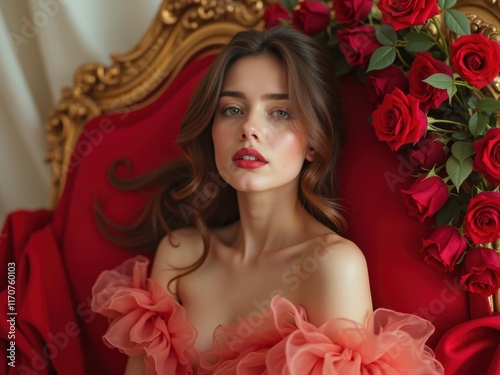 february 14, romance, luxury, red rose, elegance, beauty, woman, flower, love, celebration, sitting, styled, portrait, grace, floral, fashion, intimate, decorated, arrangement, warmth, sophisticated, charming, serene, affection, chic, background, vibrant, confident, alluring, joyful, cosy, stunning, graceful, smile, natural, artistry, glamour, sentiment, classic, festive