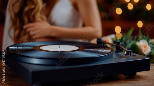woman, music, vinyl, turntable, elegant, bride, dress, flower, celebration, romantic, ambience, reception, leisure, nostalgia, closeup, sound, beauty, vintage, style, evening, relaxation, joy, happiness, home, mood, artistic, modern, classic, aesthetic, party, decoration, harmony, lifestyle, event, wedding, warmth, table, joyfulness, enchanting, richness, melody, listen, acoustic