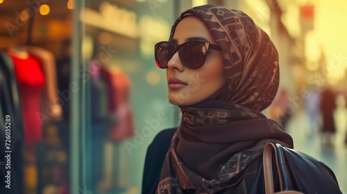 elegant, woman, shopping, city, fashion, style, luxury, retail, urban, beauty, foulard, sunglasses, bag, consumerism, mall, modern, street, lifestyle, culture, arab, wealthy, cosmopolitan, grace, poise, trend, youthful, female, shopper, boutique, elegance, sophisticated, smile, joy, happiness, leisure, activity, purchase, diversity, multicultural, apparel, accessory, chic, portrait, illustration, ai, attire, smiling