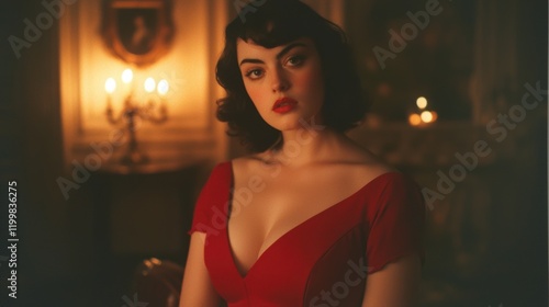 woman, elegance, vintage, glamour, red dress, portrait, beauty, soft light, romantic, interior, candlelight, alluring, coiffure, make-up, expression, mood, fashion, graceful, feminine, retro, charme, sophistication, lifestyle, decorative, atmosphere, timeless, artist, portraiture, stunning, interior design, soft focus, vivid colors, sensual, refined, enchanting, detailed, intimate, artistic, pose, character
